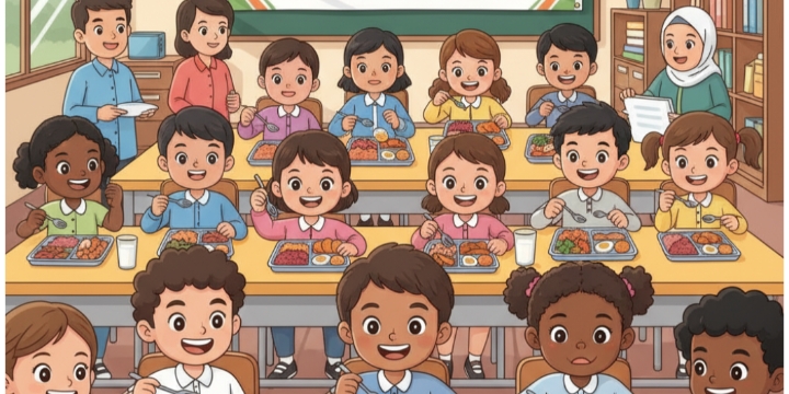 Ilustrasi sejumlah siswa sedang menyantap makanan bergizi gratis (MBG) di dalam kelas.