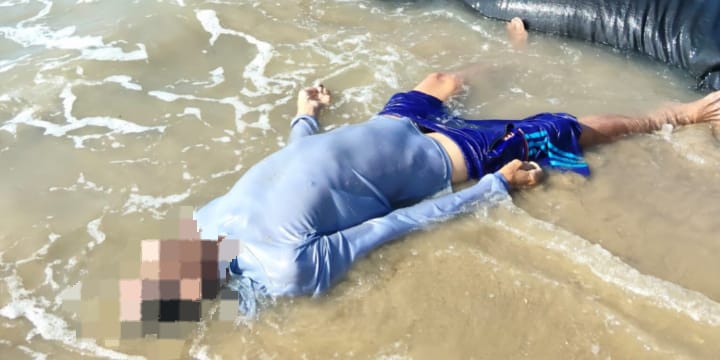 Foto kondisi korban saat ditemukan dalam kondisi sudah tidak bernyawa sekitar pukul 07.00 WIB, di bibir pantai, Sabtu (18/10/2025).