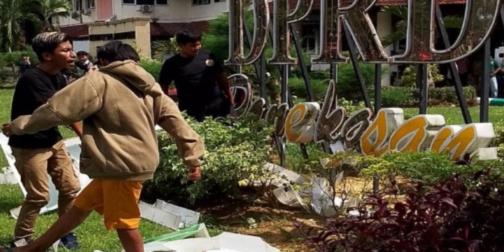 Sekitar 40 orang pendemo dengan mengatasnamakan Aliansi Masyarakat Peduli Kemanusiaan, berkumpul di depan kantor dewan itu mencopot properti DPRD yang terbuat dari akrilik di halaman depan, setelah mendapat instruksi langsung dari orator aksi bernama Iwan.