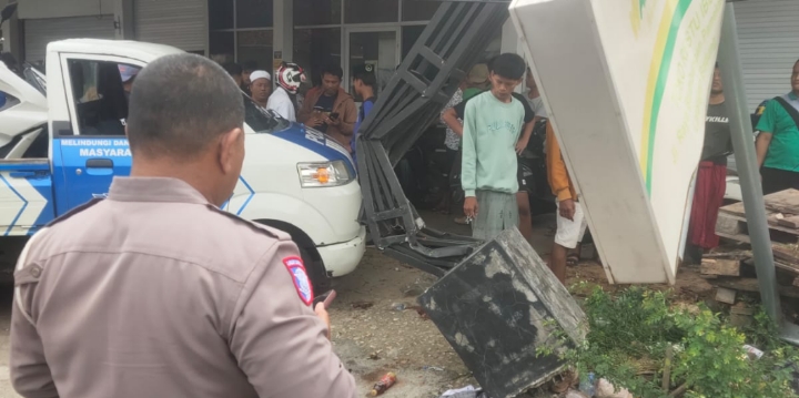 Akibat kejadian tersebut, sepeda motor oleng dan menabrak tiang penyangga Toko Almira yang berada di sisi selatan jalan.