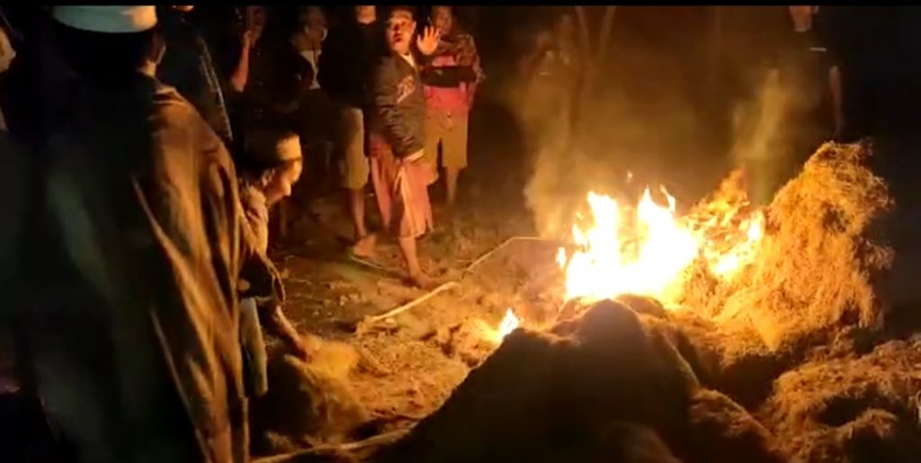 Aksi pembakaran tembakau asal Bojonegoro oleh massa yang mengatasnamakan petani di Jalan Raya Trasak, Kecamatan Larangan, Kamis (15/9/2022).
