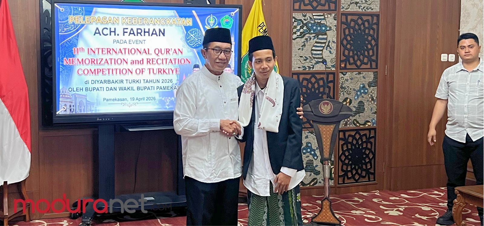 PAMEKASAN, MADURANET – Bupati Pamekasan, Kholilurrahman, melepas Ahmad Farhan, santri Pondok Pesantren Darul Ulum Banyuanyar, sebagai delegasi Indonesia pada Event 11 Tahun International Qur’an di Turki.