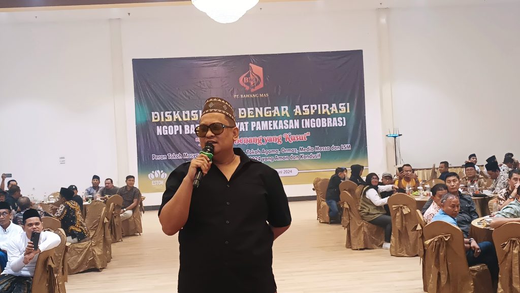 PAMEKASAN, MADURANET– Ketua Paguyuban Pelopor Petani dan Pedagang Tembakau se-Madura (P4TM), Khairul Umam menyampaikan pesan moral kepada peserta Diskusi dan Dengar Aspirasi, Ngopi Bareng Rakyat Pamekasan (Ngobrol) bersama tokoh masyarakat, tokoh politik, tokoh agama, Ormas media massa dan LSM di Hotel Odaita, Ahad (23/6/2024). Pesan itu terkait dengan semakin dekatnya Pilkada di Kabupaten Pamekasan.